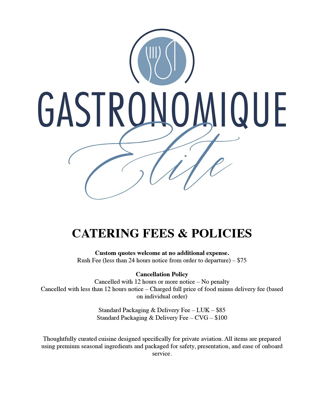 Cancellation Policy: Orders cancelled with at least 12 hours’ notice will not incur any penalty. Orders cancelled with less than 12 hours’ notice will be charged in full for the food portion of the order, with the delivery fee removed.